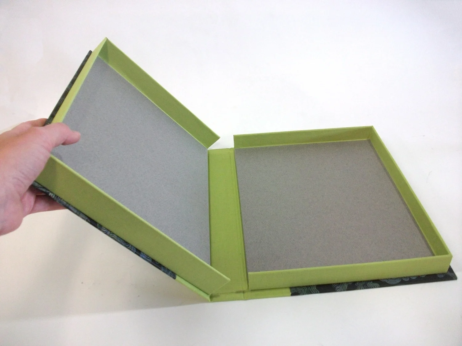 Present your photos, prints or documents in this beautiful portfolio box. Created from our line of hand-painted decorative papers, this box features black paste paper with green undertones which are highlighted by the chartreuse book cloth covering the box, spine and hinge. This is a medium sized box that holds 8 ½” x 11” papers. The one inch, interior box could hold an collection of 30-40 prints printed on BFK Rives or approximately one hundred documents or photographs. The full measurements are 9 ¾” x 12 ½” x 1 ½” when closed.